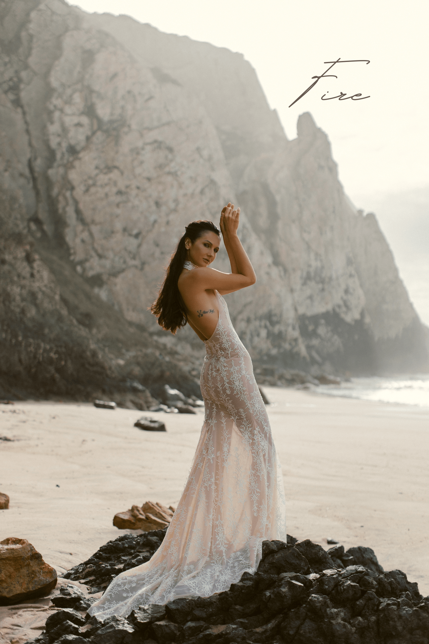 A second-skin silhouette traced in lace, halter neckline, bare back —