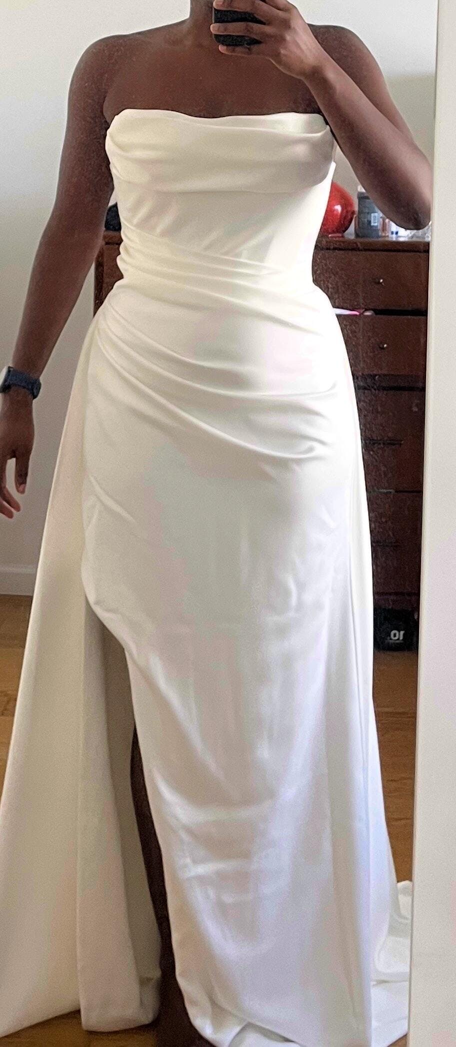 ORDER YOUR DRESS HERE!!! I could not be happier than my custom size wedding dress. I have to share with others since I had been very nervous about ordering my wedding dress online. Photo is of first try on out of the box! You guys, the construction is IMPECCABLE! ALL of the seams line up perfectly including boning and lining. I think that fact alone carries a lot of weight when it comes to thoughtful construction. It also has built in bra cups. The off white fabric is amazing quality and the lining carries all the way through the end of the train. It’s medium weight - not flimsy but not too thick. Nothing is see-through and it looks EXPENSIVE. It arrived to me in a few weeks, hardly a wrinkle from shipping and fit perfectly on first zip. I will not have to do any tailoring as they truly did followed my custom measurements.
