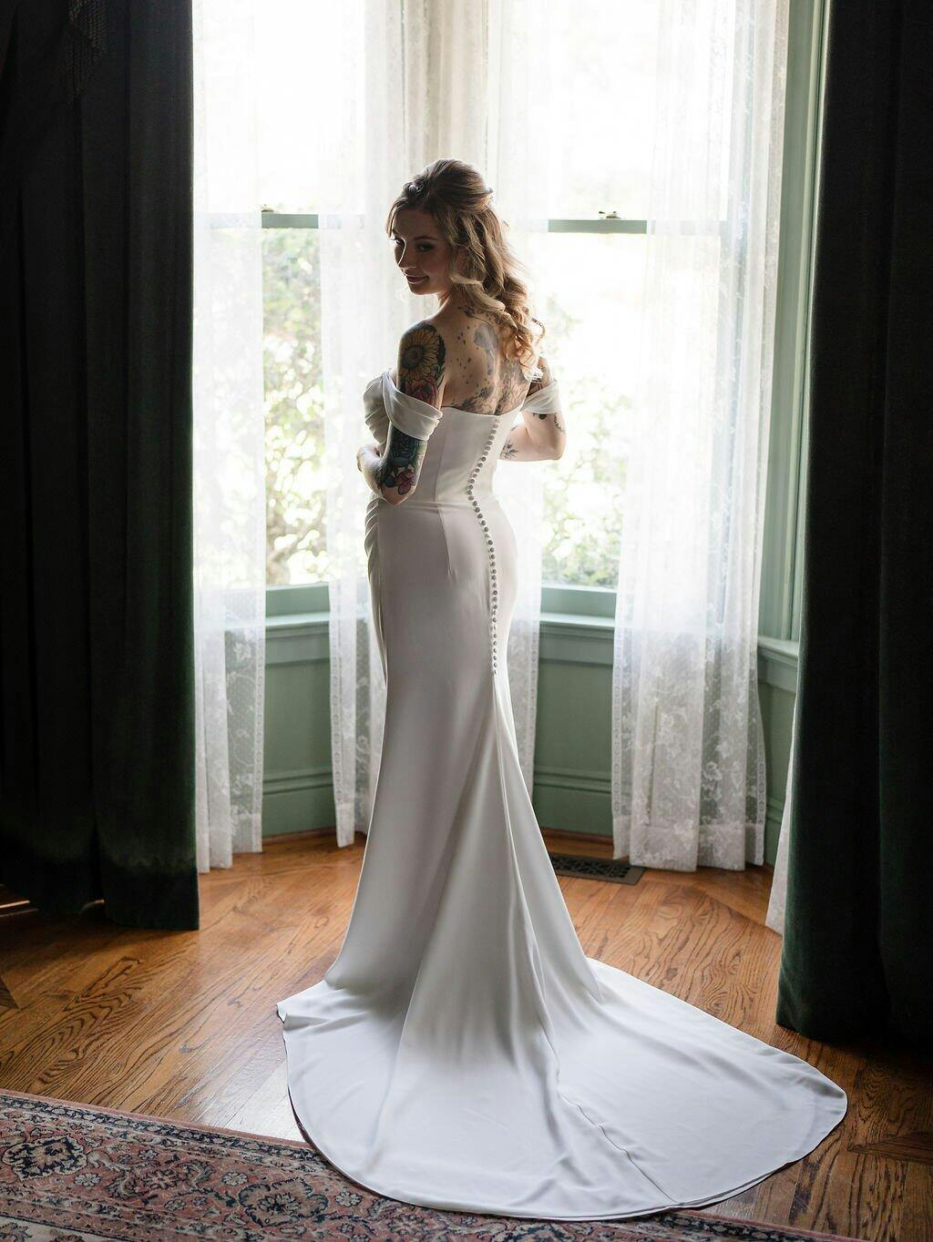 The bridal dress is in a minimalistic design with off-the-shoulder short-sleeves, and a corset bodice with a sensational drapery will be the center of attention. The back of this wedding dress is complemented with beautiful bridal buttons and an open back.