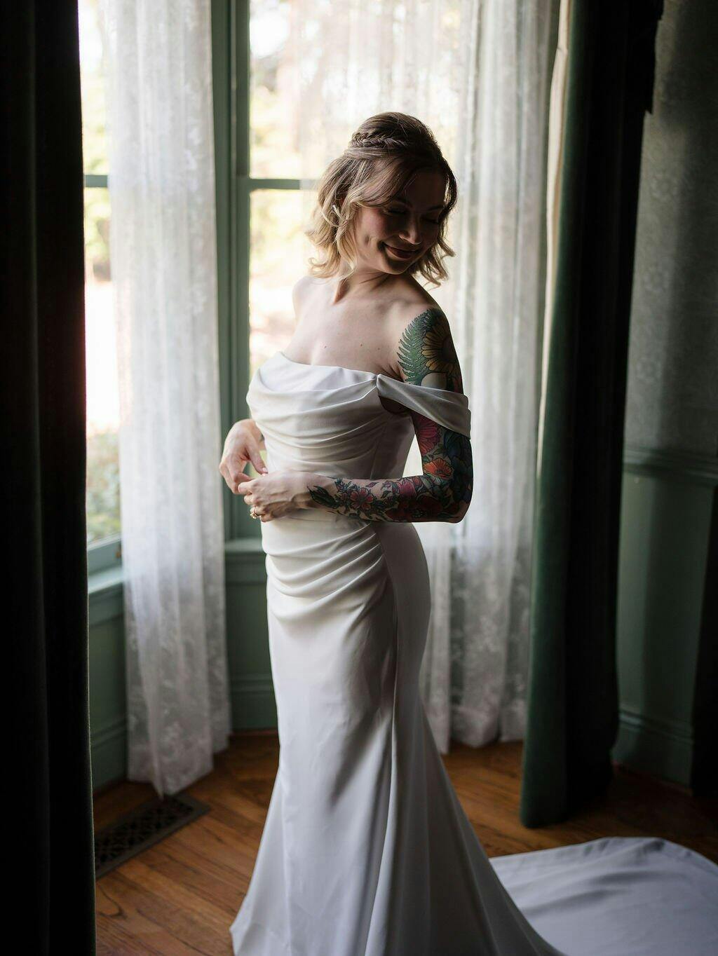 A wedding dress with off-the-shoulders, and beautiful drapery is a dream dress for all brides.