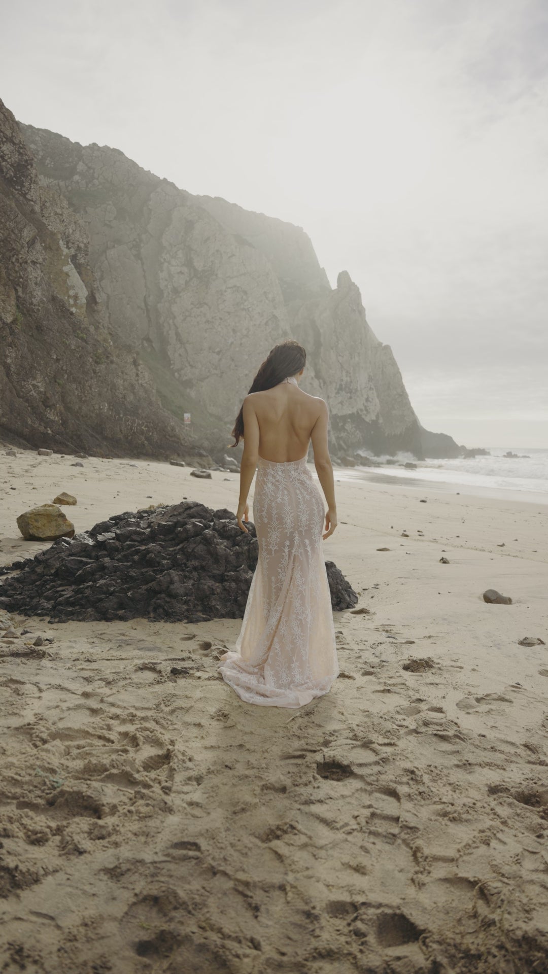 FIRE is a second-skin mermaid silhouette in blush-nude lace — hand-embroidered, sheer, and unapologetically powerful.
