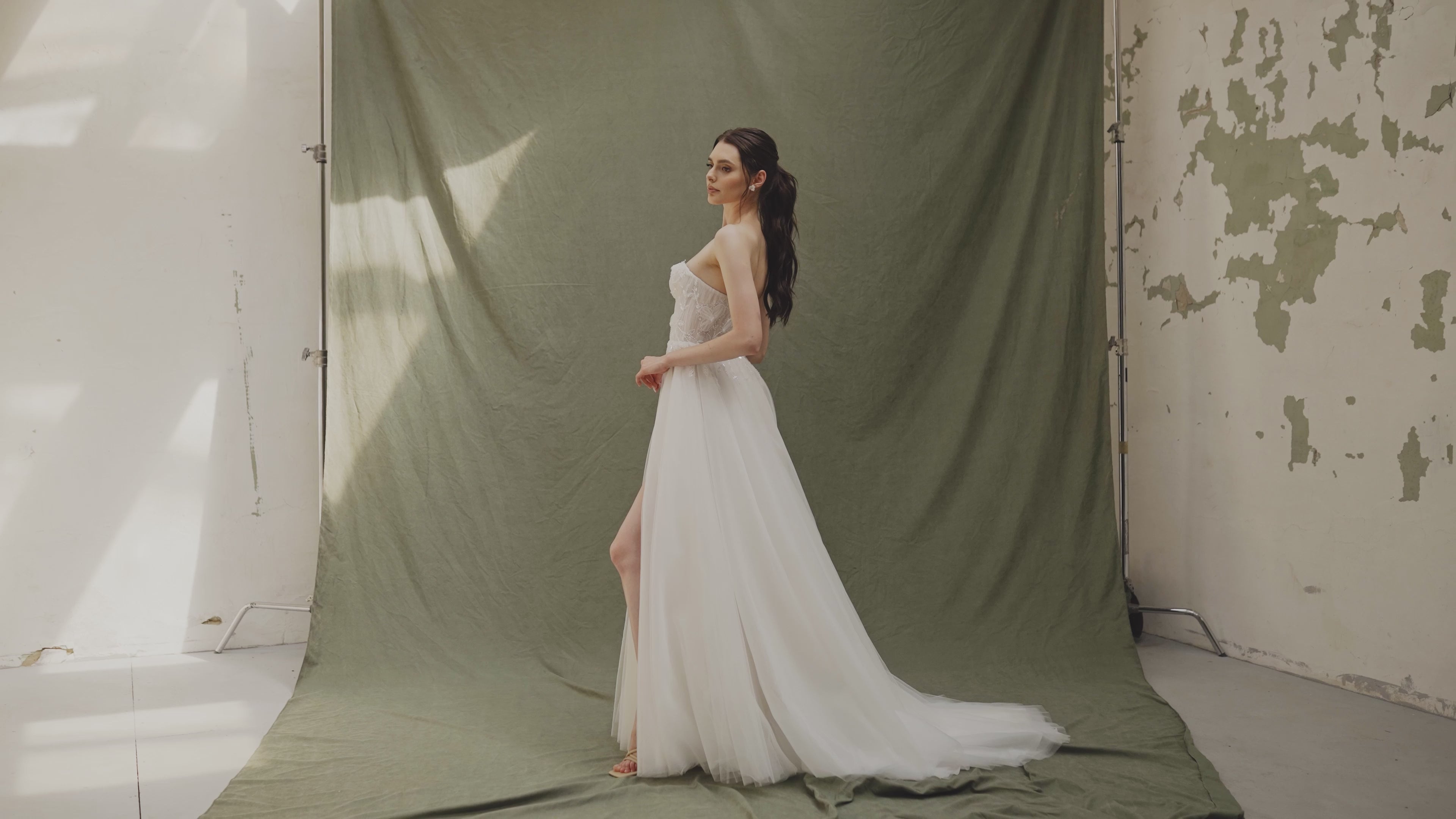 A romantic A-line gown with a touch of boldness — featuring a high slit and a sculpted, strapless corset.