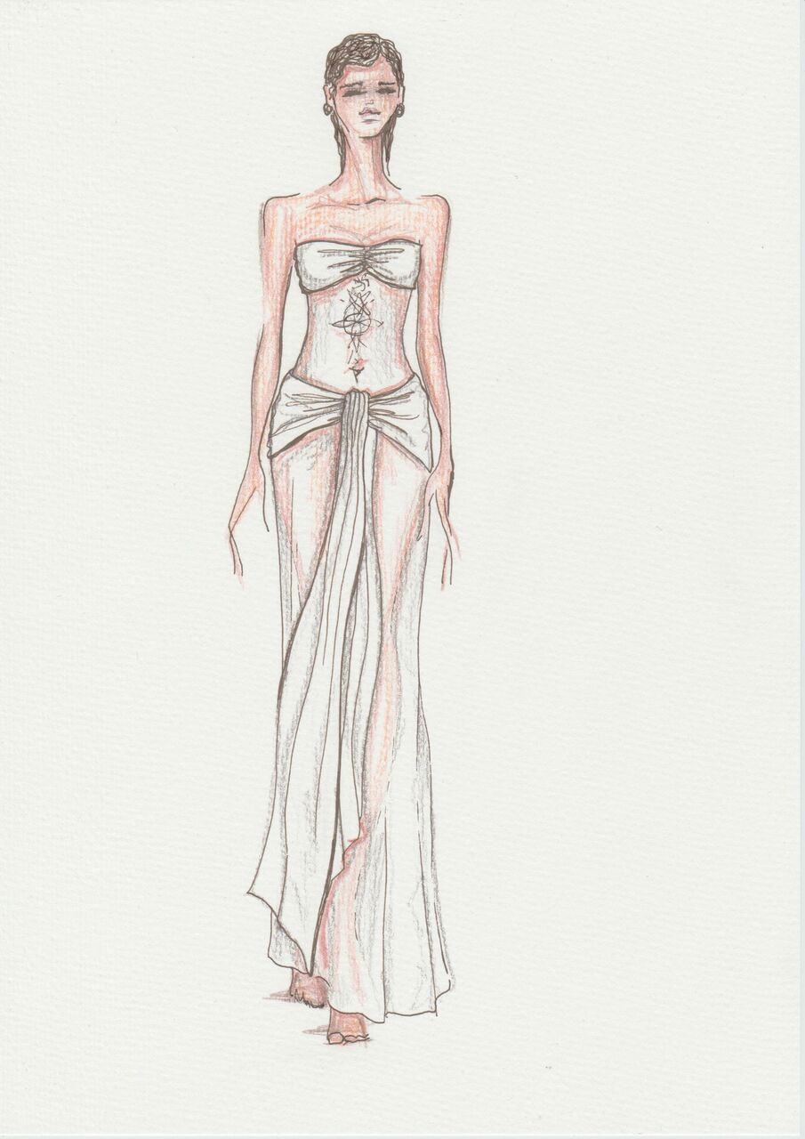 We then translate the concept into a full gown illustration, carefully shaping how the symbol will live on the dress.