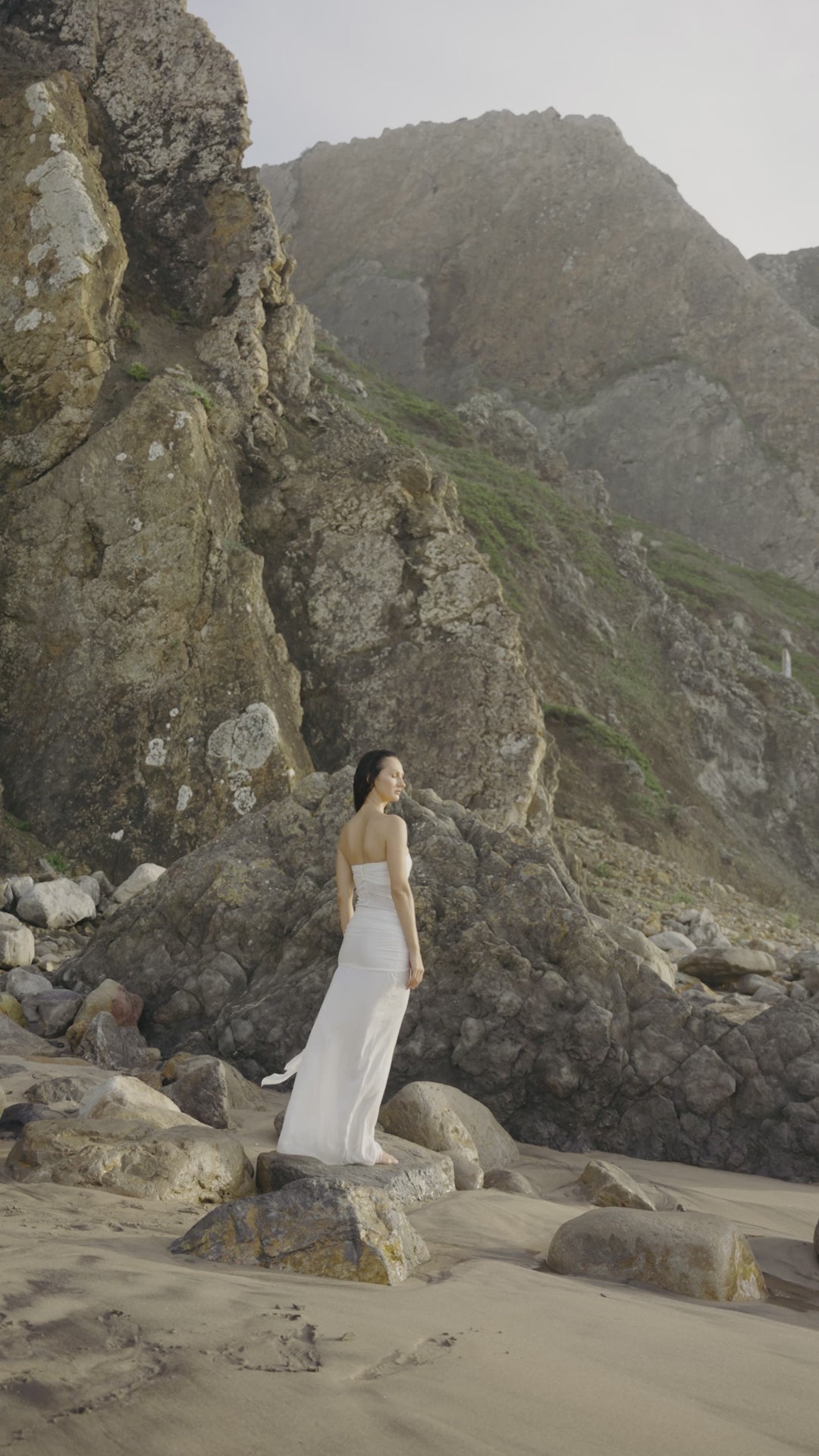 A removable silk draped hip sash offers a nod to elemental movement — tied, not fixed.