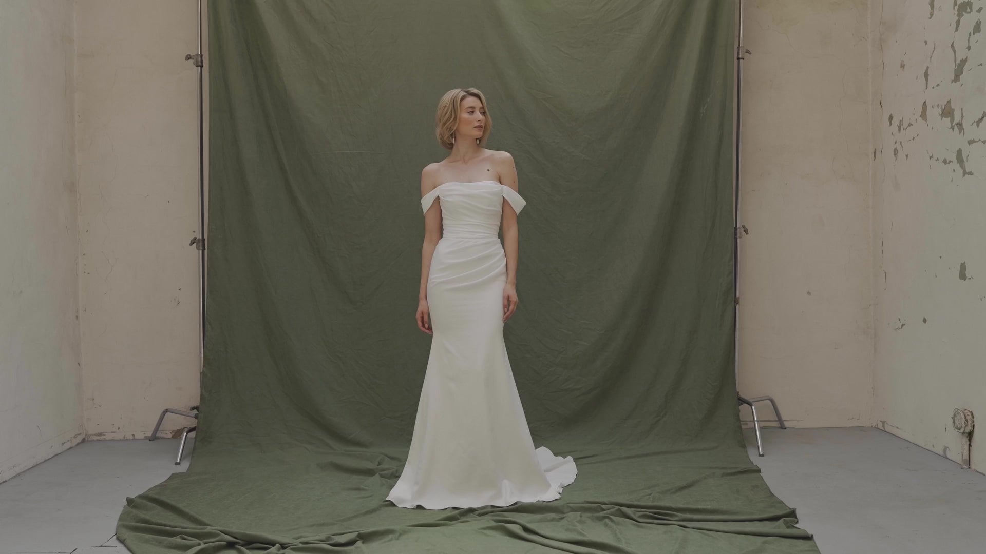 A wedding dress with off-the-shoulders, a straight neckline, and beautiful drapery is a dream dress for all brides.