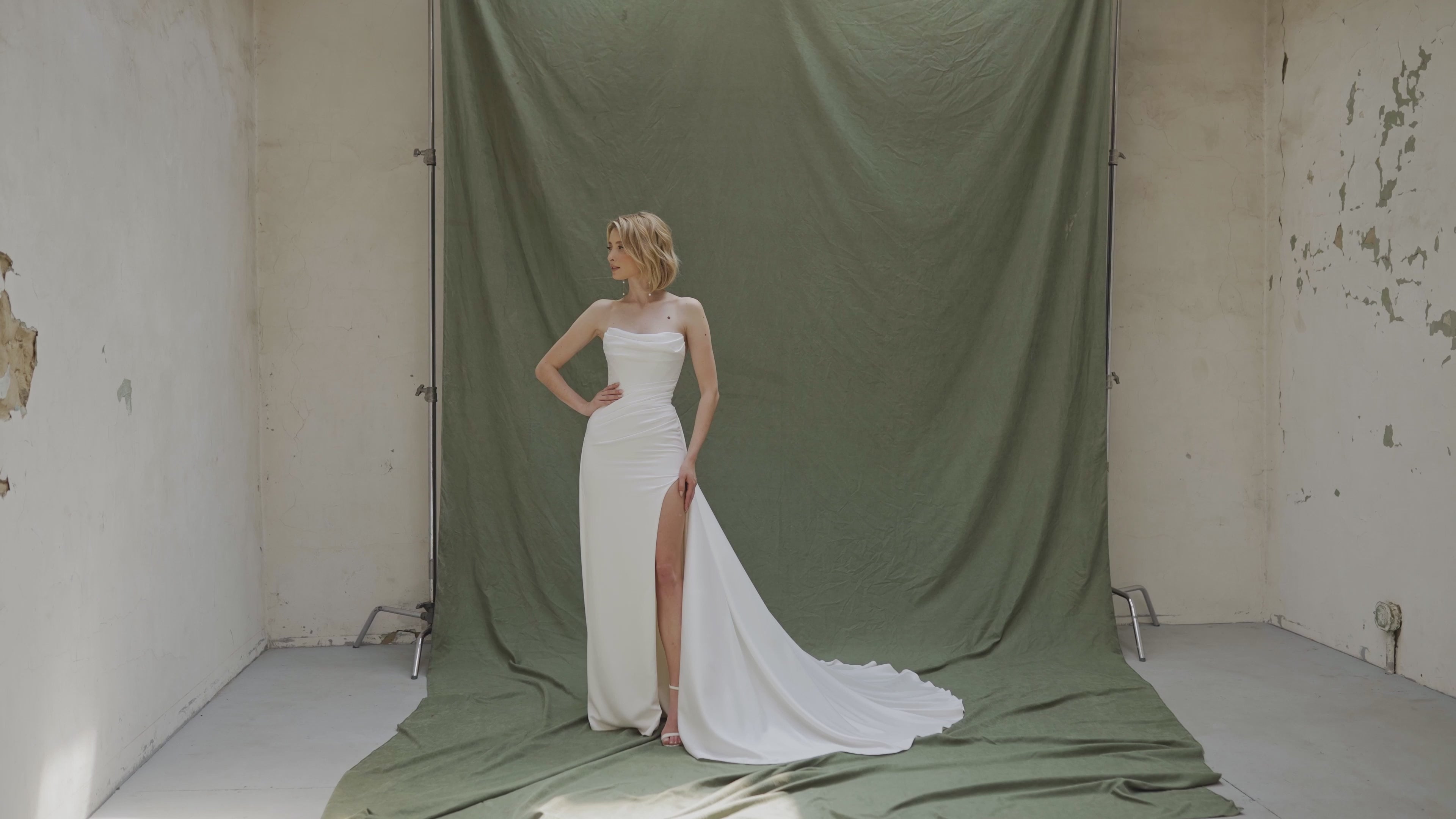 A satin wedding dress with a mermaid skirt, gathered drapery, and a high slit makes the perfect look.